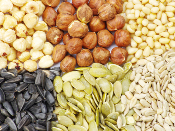 Kacang almond, kenari, dan biji chia kaya akan lemak sehat, protein, serta vitamin E. Vitamin E merupakan antioksidan kuat yang menjaga kesehatan membran sel otak dan mencegah penurunan fungsi kognitif akibat penuaan.
