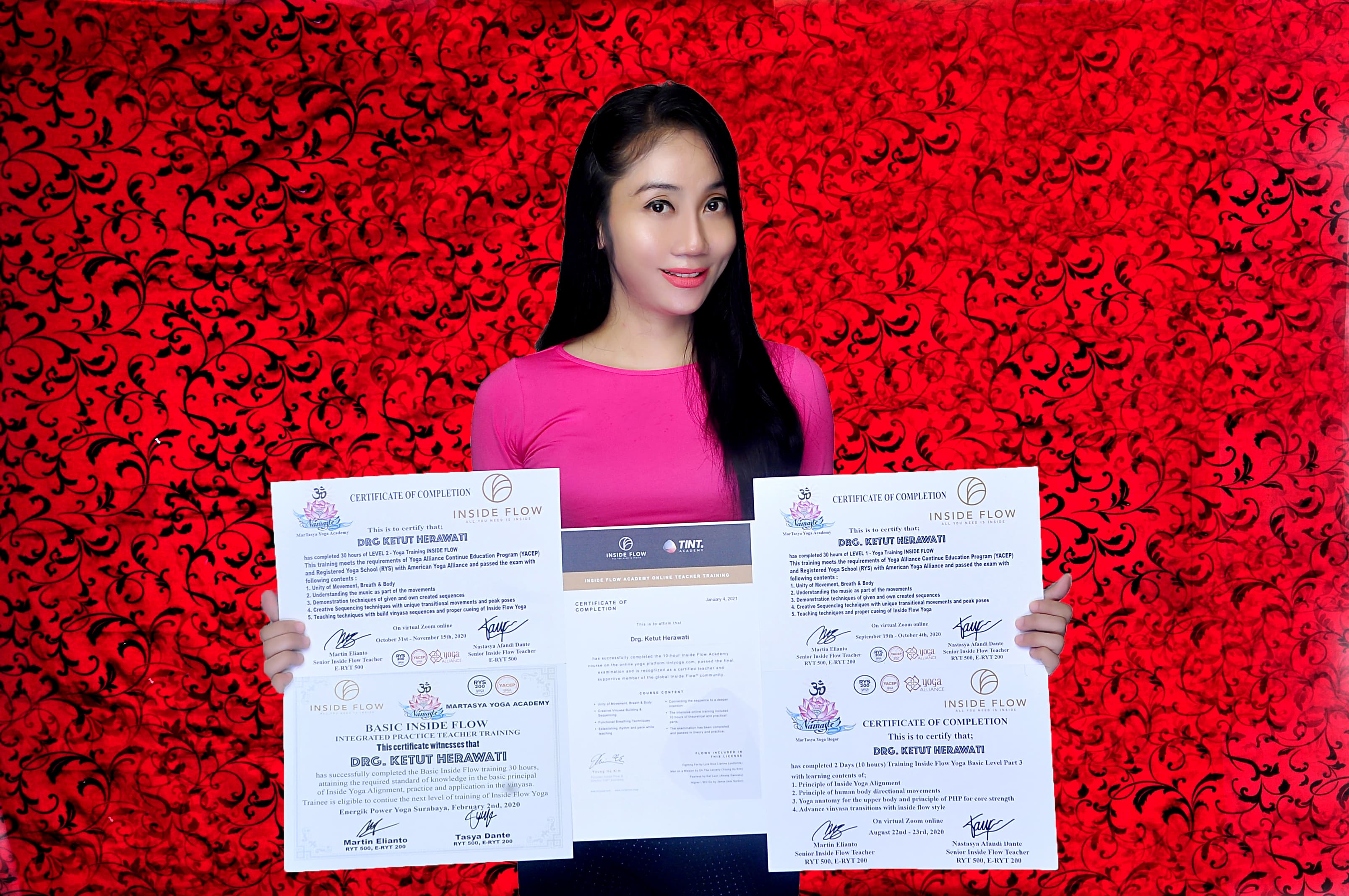 Ia pun rajin mengikuti pelatihan dan terus memperbarui ilmunya. Saat ini, Miss Hera sudah mengantongi berbagai sertifikasi teacher training dari beragam jenis yoga.